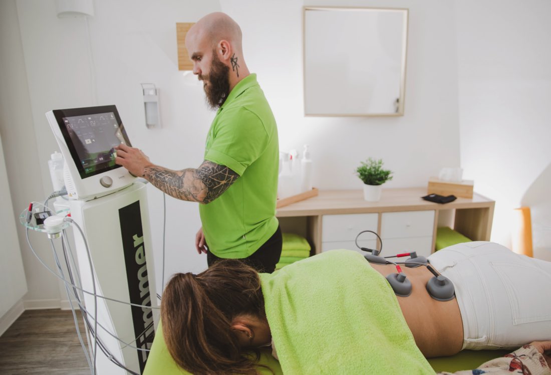 Anwendung elektrischer Ströme zur Schmerzlinderung und Muskelstimulation.